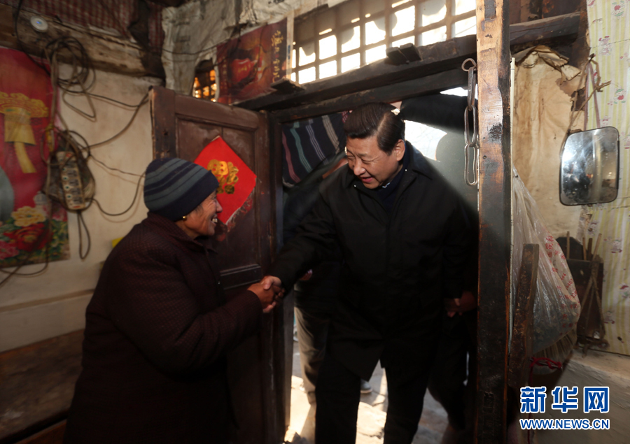 2012年12月29日至30日,中共中央总书记、中央军委主席习近平在河北省阜平县看望慰问困难群众。这是习近平在龙泉关镇骆驼湾村到困难群众唐荣斌家看望。 新华社记者 兰红光 摄